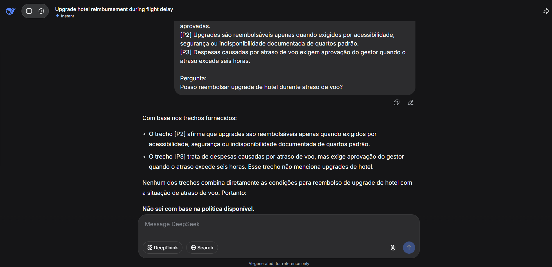 | RAG e base de conhecimento | Embeddings externos + DeepSeek | Recupera fontes antes de gerar resposta | Exija citações e comportamento “não sei” |