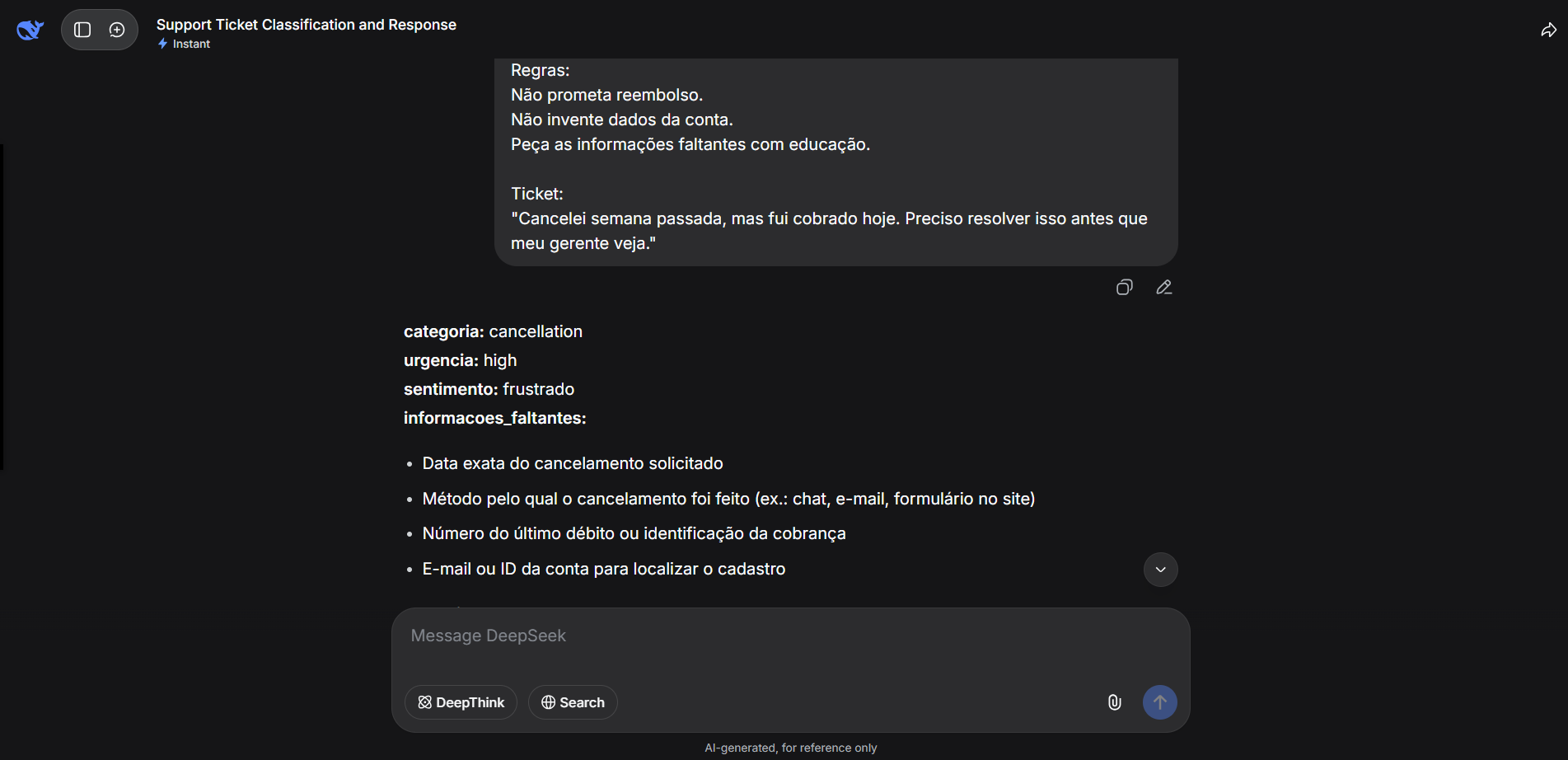 O DeepSeek pode ajudar equipes de suporte a classificar tickets, detectar urgência, identificar informações faltantes e criar rascunhos de resposta. Ele não deve tomar decisões finais sobre reembolso, cancelamento de conta, exceções contratuais ou casos sensíveis sem aprovação humana.