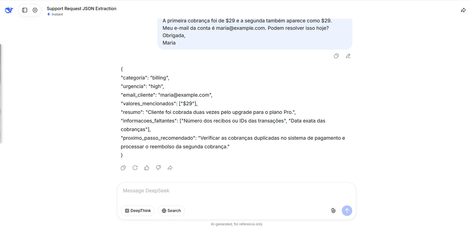 Extração de dados estruturados é um dos casos de uso da API DeepSeek mais claros, porque a saída pode ser validada por schema. Em vez de pedir um resumo em texto livre, você pode pedir um objeto JSON previsível para enviar a um CRM, help desk, planilha, banco de dados ou fila de automação.