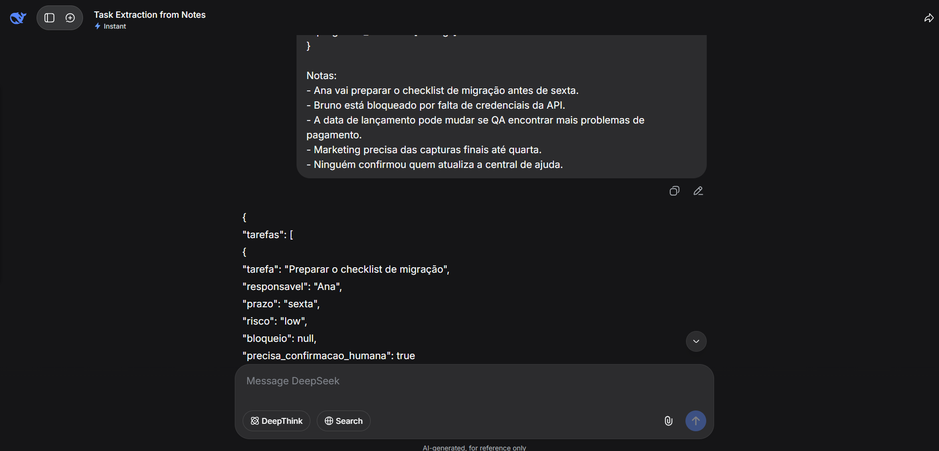 Por que o DeepSeek se encaixa: deepseek-chat pode organizar notas rapidamente. JSON Output é útil quando o brief alimenta um CMS ou sistema editorial. deepseek-reasoner pode ajudar quando há comparação de posicionamento, risco e lacunas de fonte.